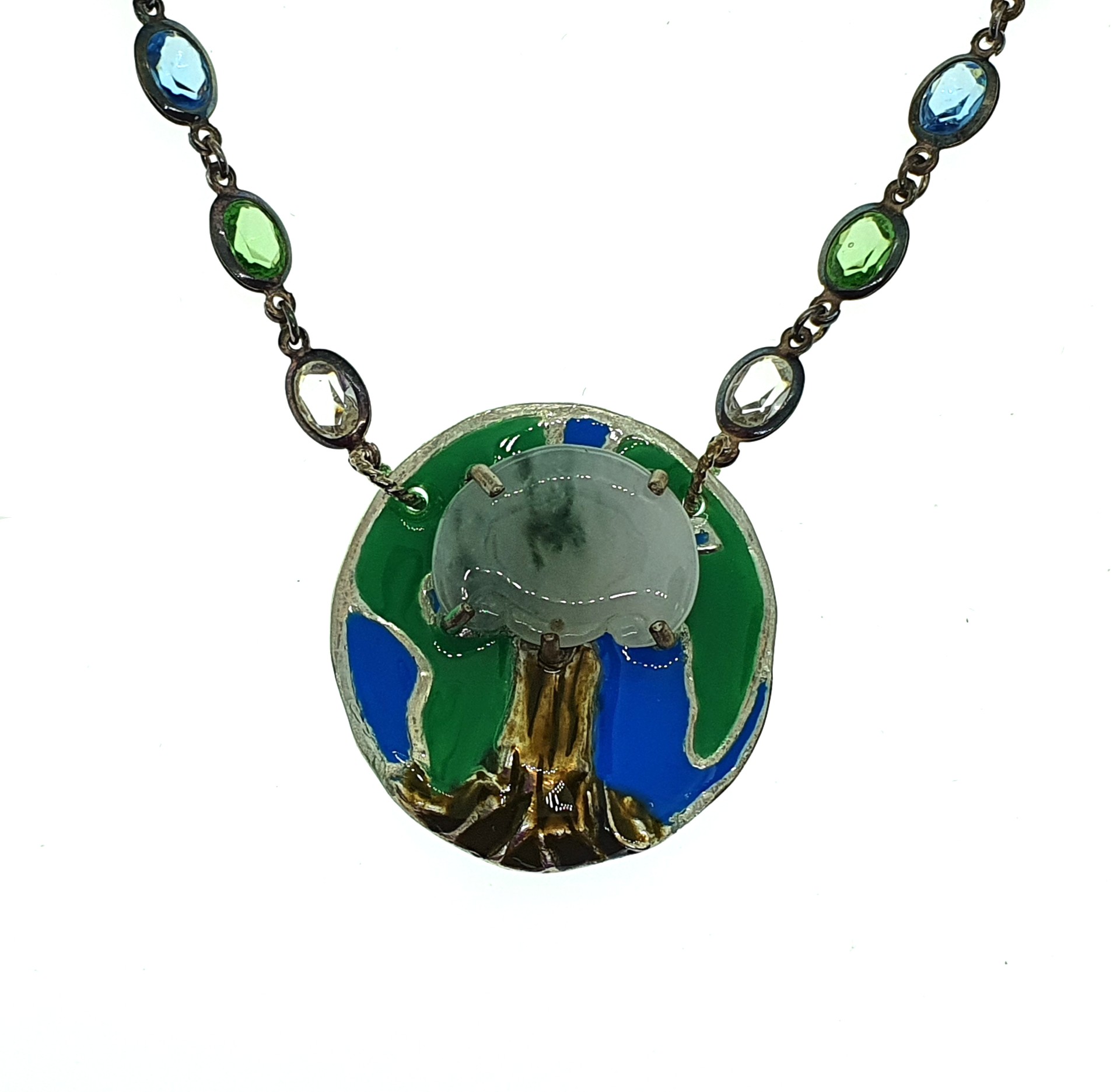 The jade pendant from the old necklace is whitish with some shades of green. When the pendant is inverted, it can be viewed as the crown of a tree. As trees are considered the lungs of the Earth, this is related to the theme: Mother Earth. This becomes the centerpiece in the new necklace. This centerpiece (a.k.a. Lungs of the Earth) is fashioned as a tree with planet Earth in the background.