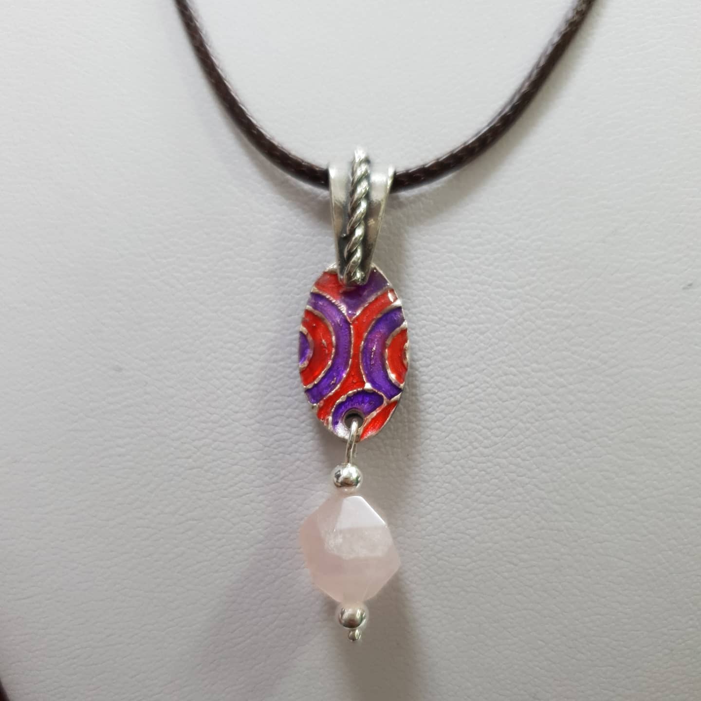 Pendant made from Art Clay Silver (999 silver) attached to 925 silver bail and 1 cm x 1 cm faceted rose quartz bead and small silver space beads, UV resin on the back